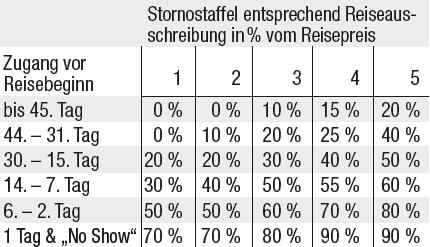 Der Reiseveranstalter hat die nachfolgenden Entschädigungspauschalen unter Berücksichtigung des Zeitraums zwischen der Rücktrittserklärung und dem Reisebeginn sowie unter Berücksichtigung der erwarteten Ersparnis von Aufwendungen und des erwarteten Erwerbs durch anderweitige Verwendungen der Reiseleistungen festgelegt. Unter Beachtung des Zeitpunkts des Zugangs der Rücktrittserklärung des Kunden beim Veranstalter wird die pauschale Entschädigung wie folgt mit der jeweiligen Stornostaffel berechnet.